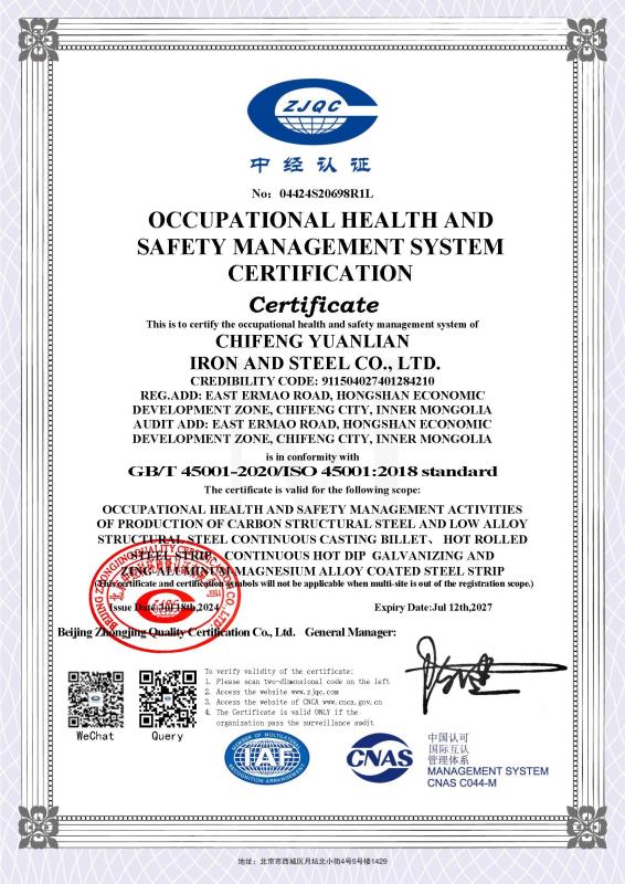 职业健康安全管理体系认证证书